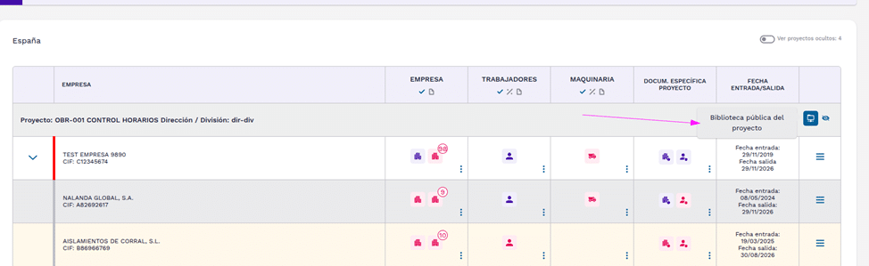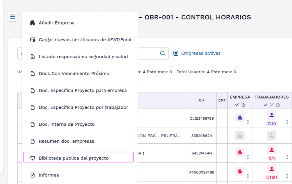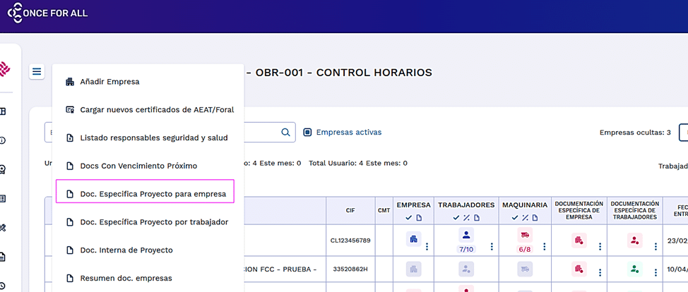Entramos en un proyecto. Desde el menú de tres líneas principal de la página, acceder a Doc. específica Proyecto para empresa.