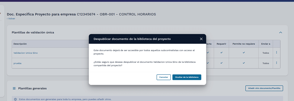 Con el pop up de confirmación para ocultar dicha plantilla. Si le damos a cancelar, no hace nada y nos cierra el pop up.